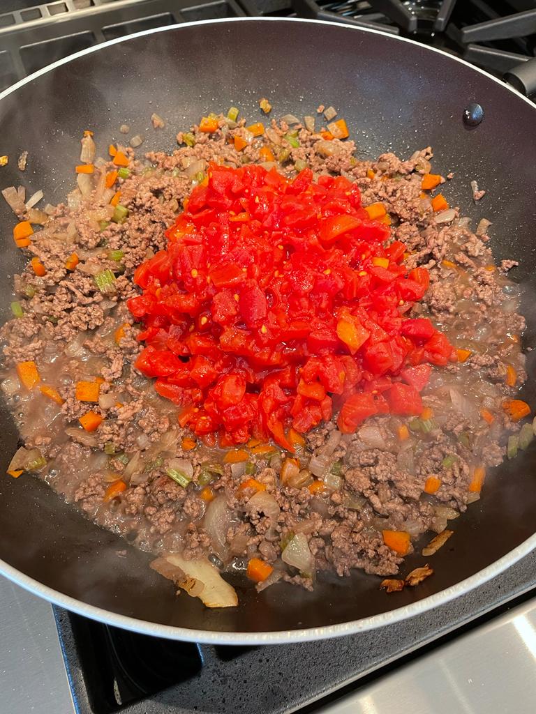 - Add in the red wine and cook until the wine is reduced down before adding in the diced tomatoes, tomato paste, stock and bay leaf.