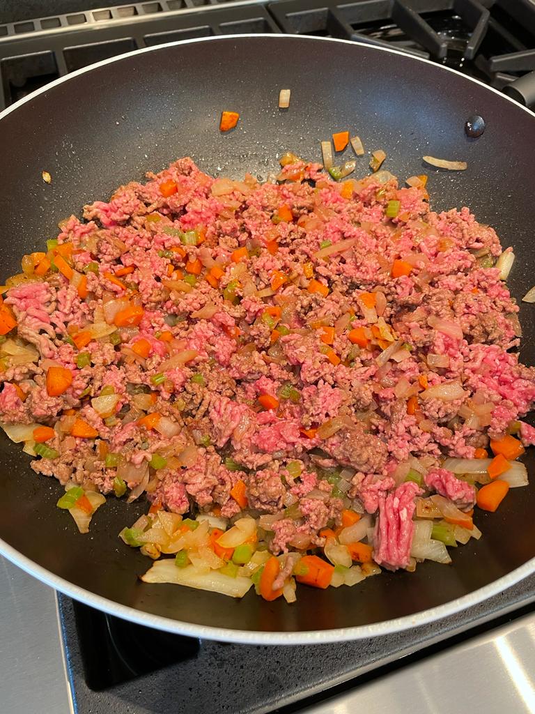 - Add in the minced beef and break up with the spoon. Cook over a fairly high heat to get a good colour on the beef (colour is flavour) stir occasionally until the meat is no longer pink.