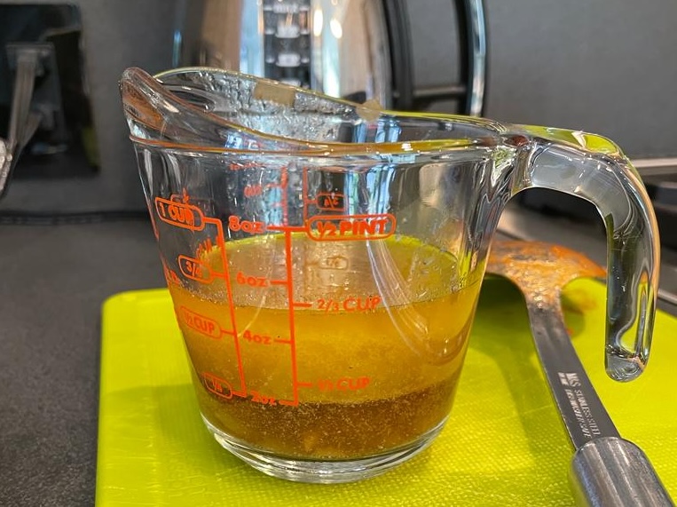 - At this stage I like to remove any excess fat and oil from the pan and I can assure you it will not affect either flavour or texture in a negative way so using a slotted spoon, tip the pan slight and spoon the excess liquid into a small jug.Be sure not to pour this down your kitchen sink as it will solidify and block drains. I use an empty bottle with a cap and once cooled pour it into the bottle and discard with my general waste.