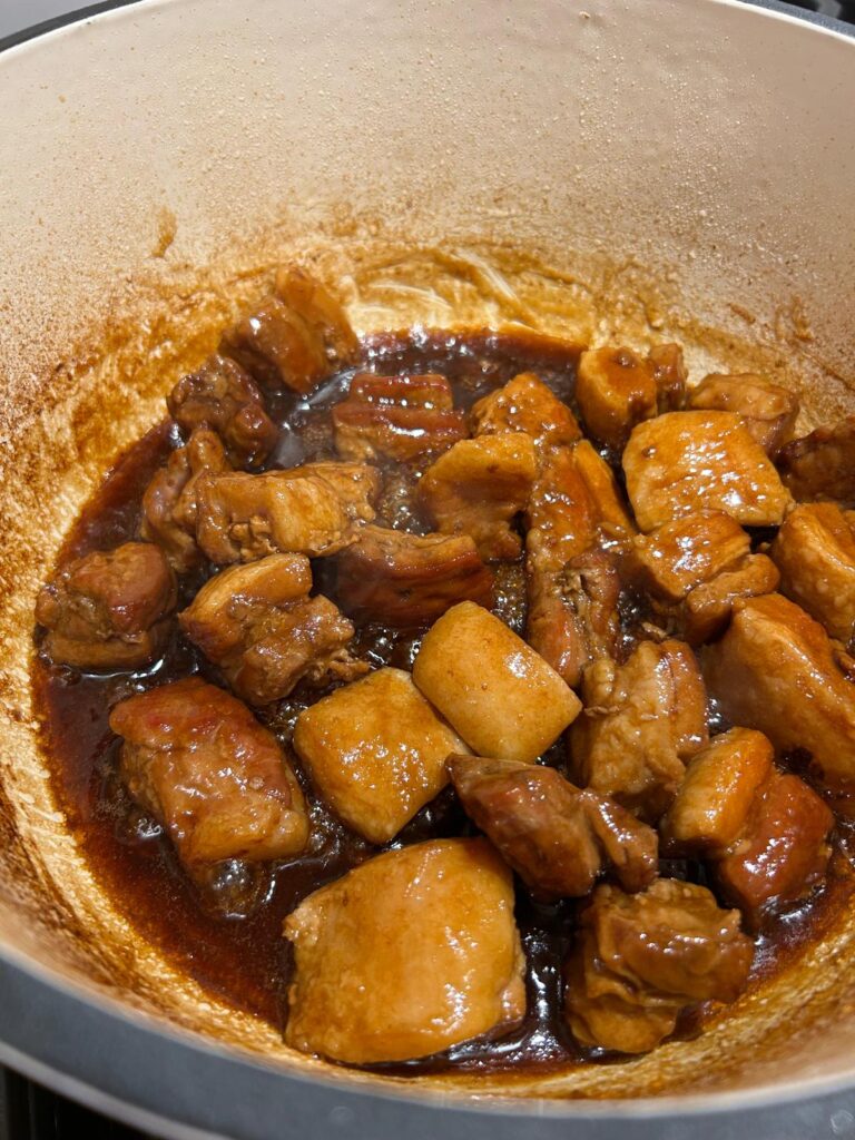 • Heat the oil in a wide bottomed skillet or dutch oven and cook the pork belly until golden on all sides. This will take around 20 minutes.