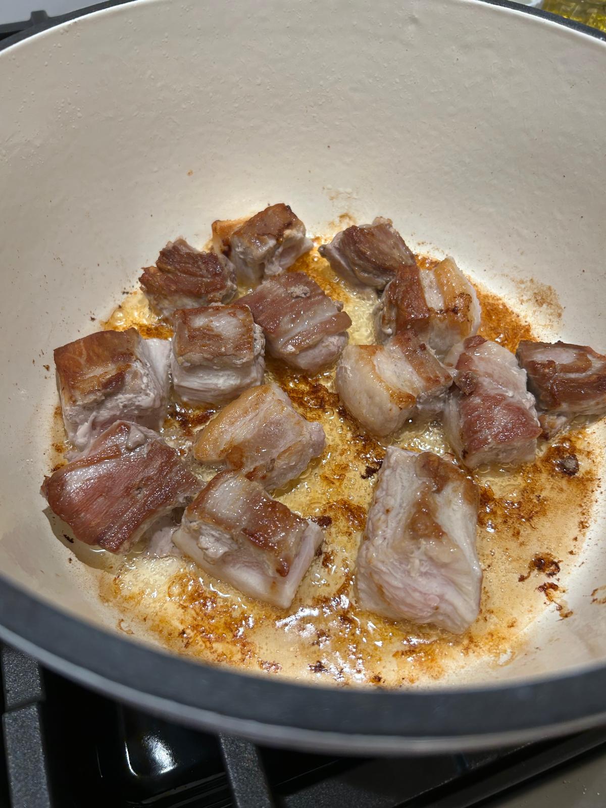 • Heat the oil in a wide bottomed skillet or dutch oven and cook the pork belly until golden on all sides. This will take around 20 minutes.