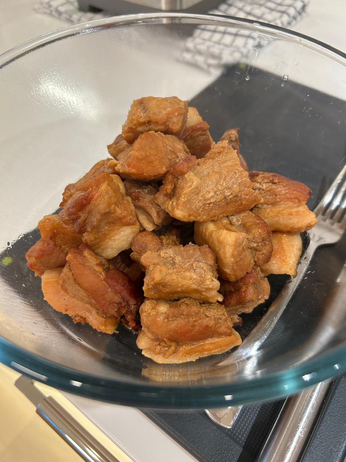 • Remove cooked pork belly from the liquid and place into a bowl and set aside.