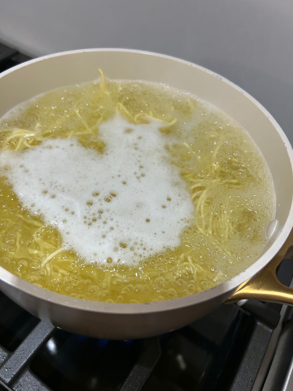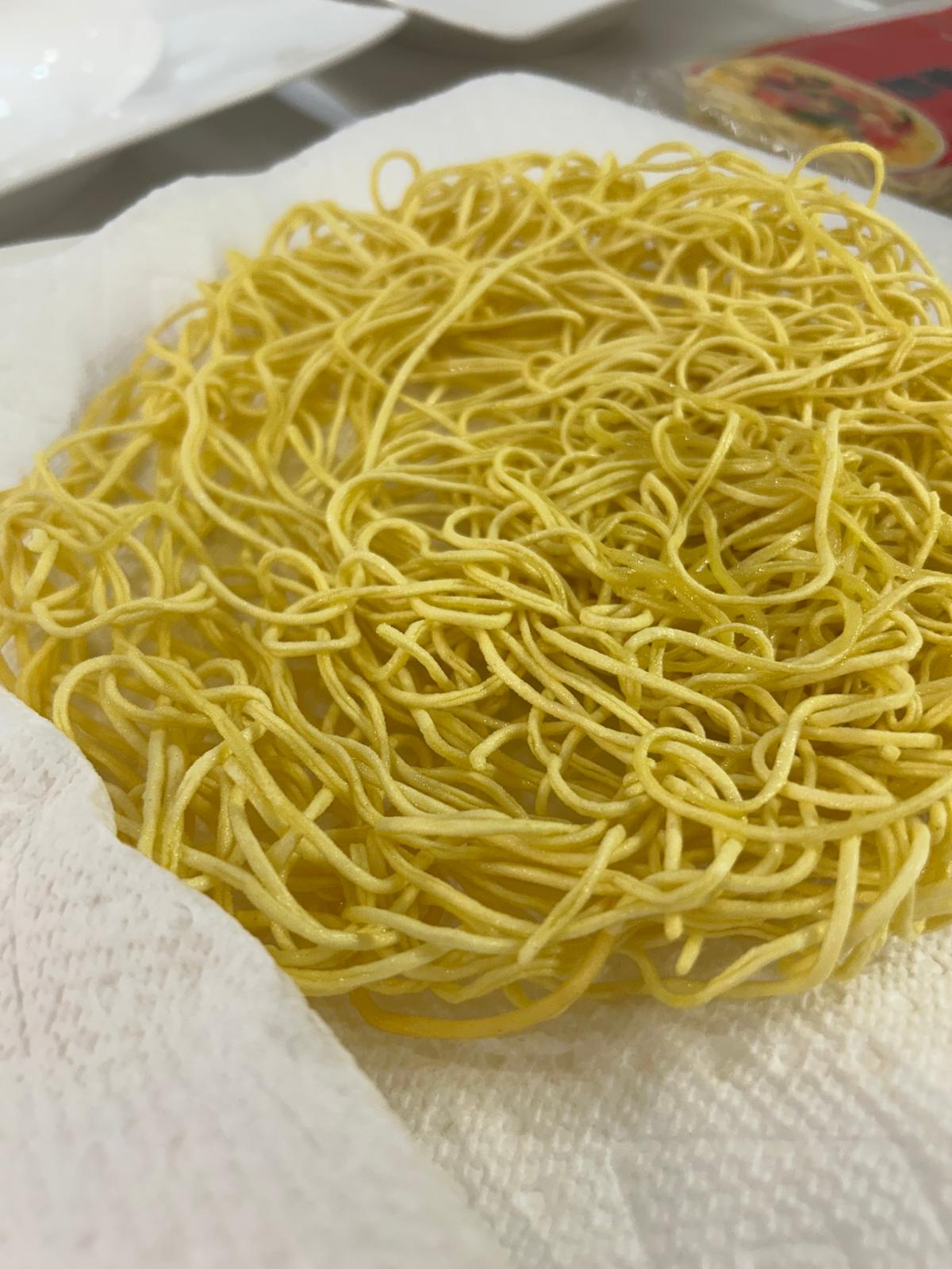 • Remove the noodles from the boiling water and shake off any excess water then very carefully add them into the hot oil. Do this very gently and the oil will rise and spit so add the noodles a little at a time.