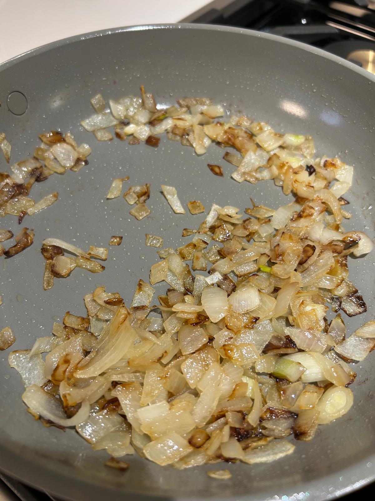 - Add a tablespoon of oil to a skillet over a medium heat and add in the chopped onion. Cook until softened and starting to turn golden. Season with salt. Remove from the heat and set aside.
