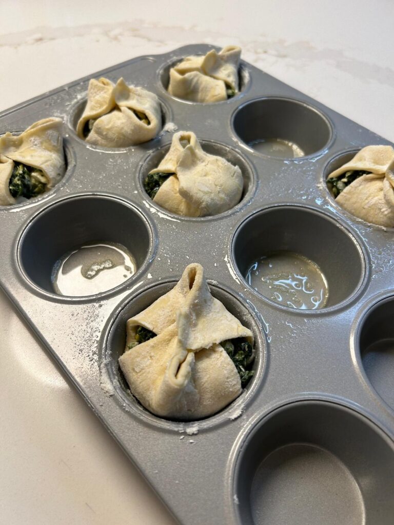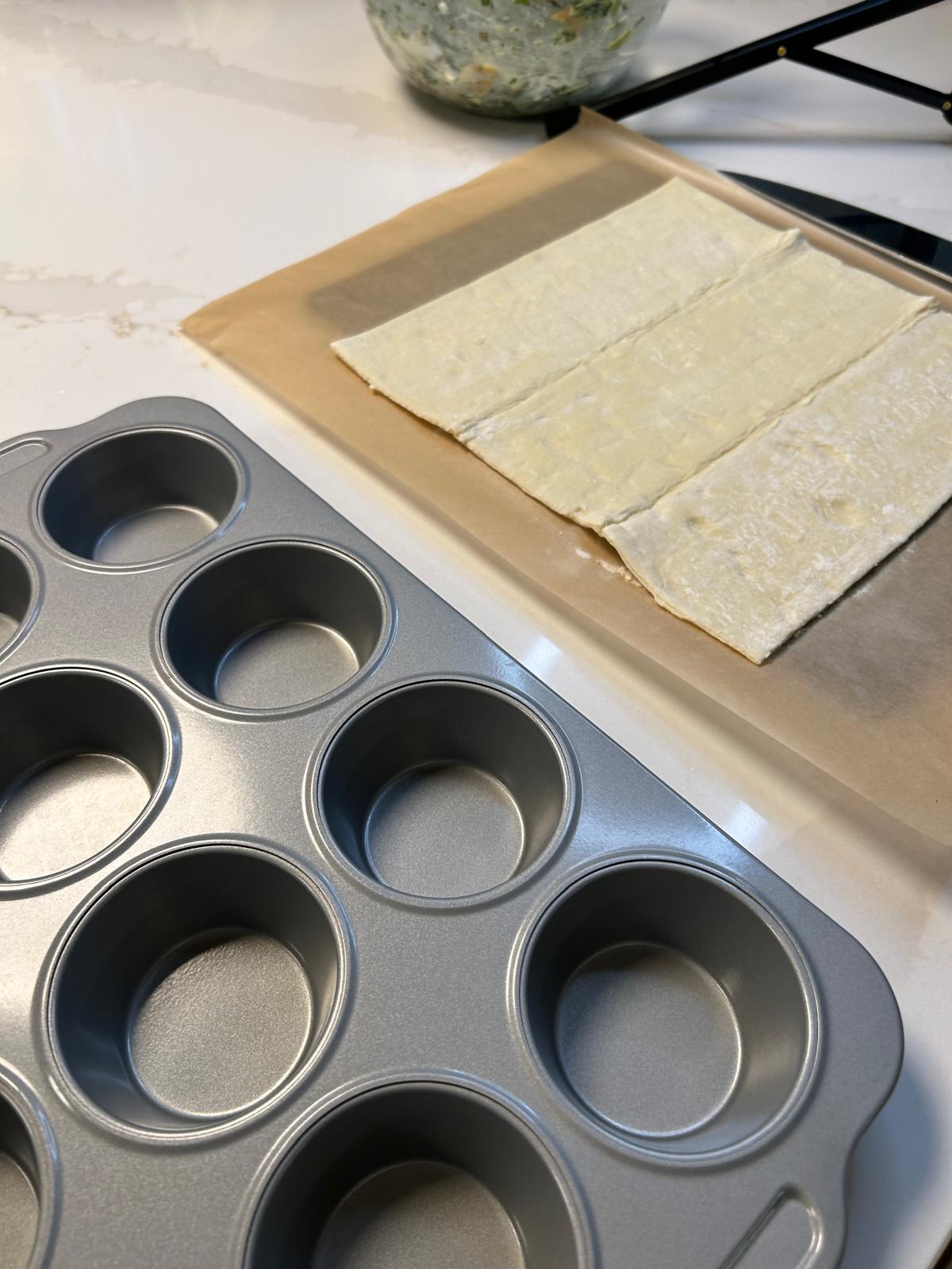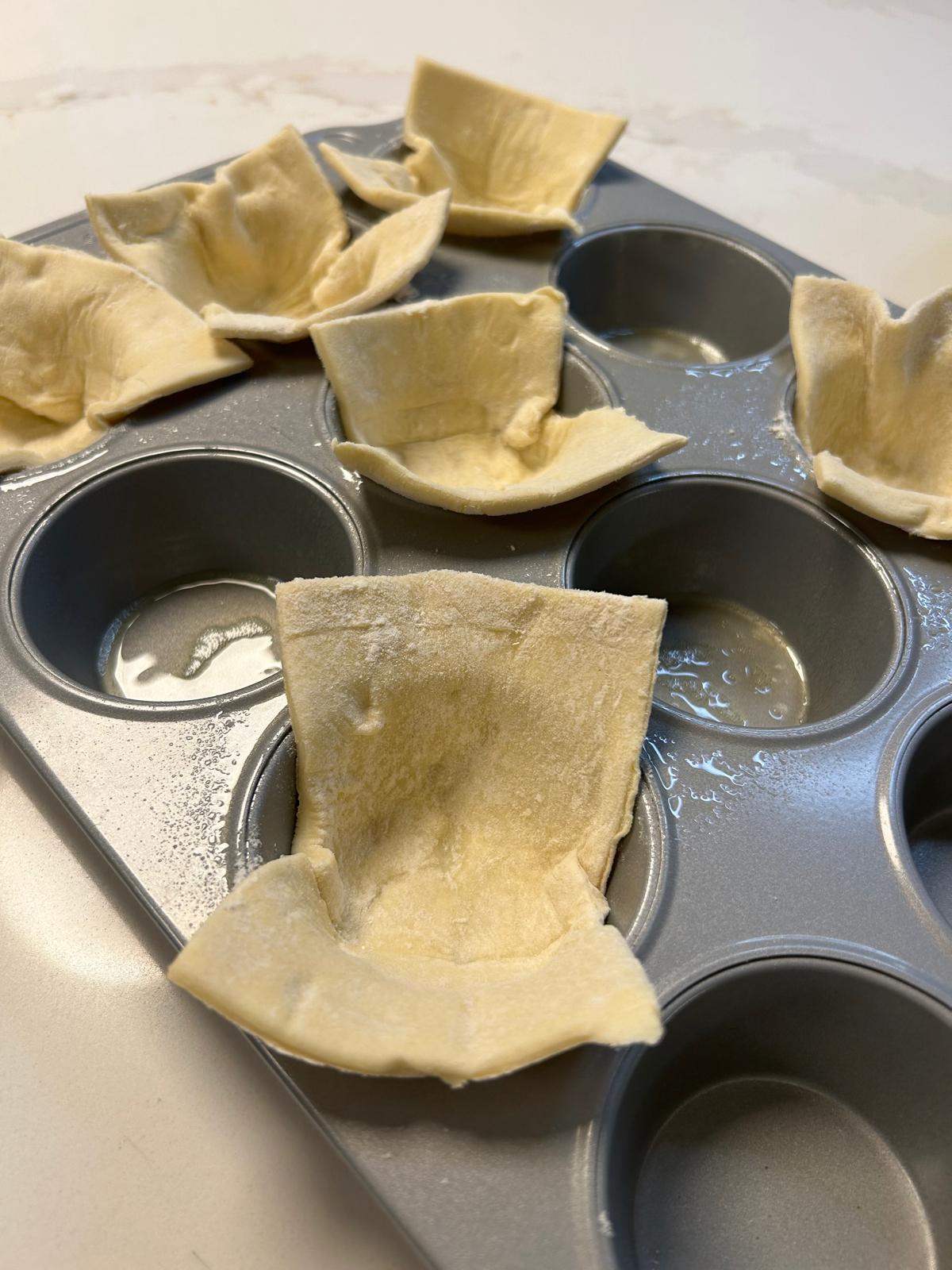 - Place each of the puff pastry squares into a muffin hole allowing the sides to hang over.