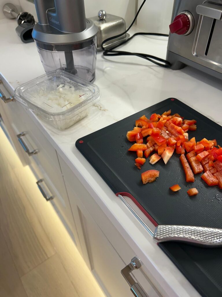 - Remove the stem from the bell pepper and set aside. Remove the seeds from the pepper and cut into quarters. Place two quarters into a food processer along with quarter of a sweet onion and pulse until minced finely.