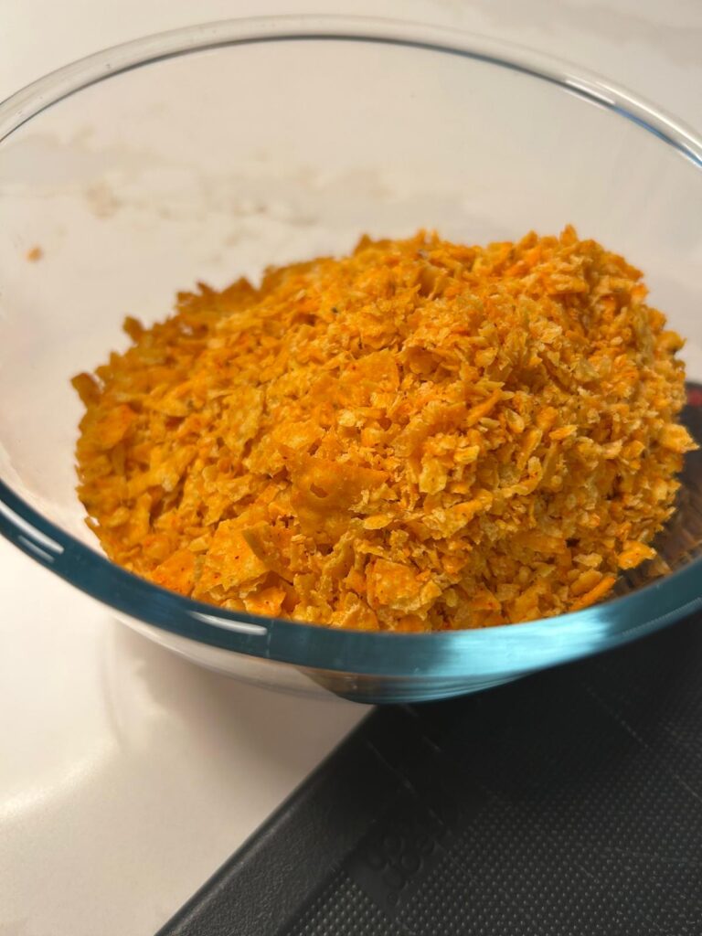 - Place the ritz crackers or flavored chips into a plastic bag, seal and using a rolling pin, crush the crackers or chips until they resemble crumbs.