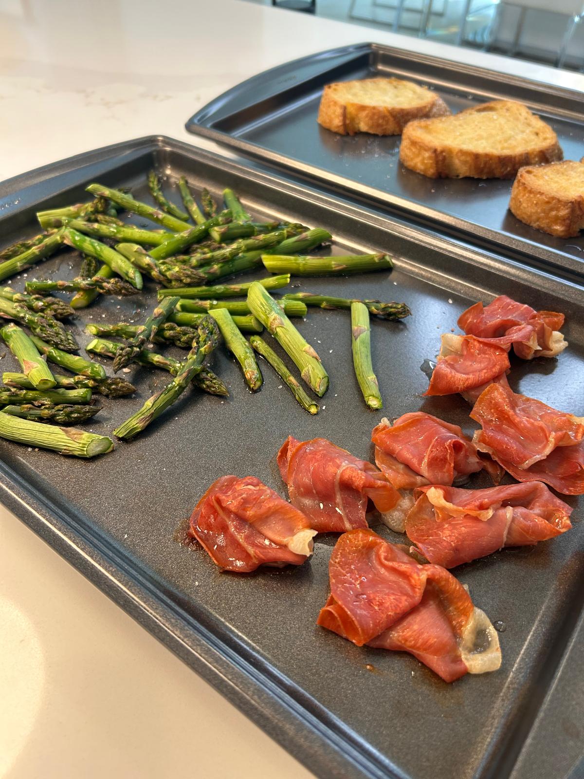 - Take two baking sheets and lay the asparagus on one side of one and bundles of the prosciutto on the other side.
