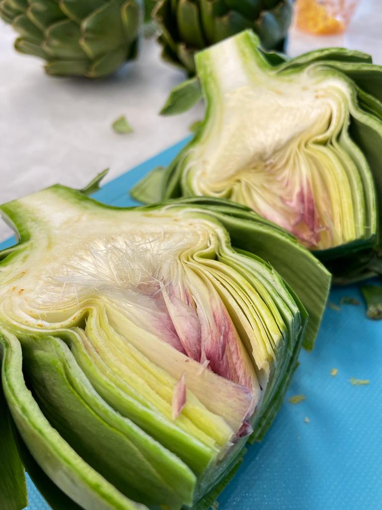 - Slice the artichokes in half and remove the choke and any purple leaves. I use a spoon to scoop it out.