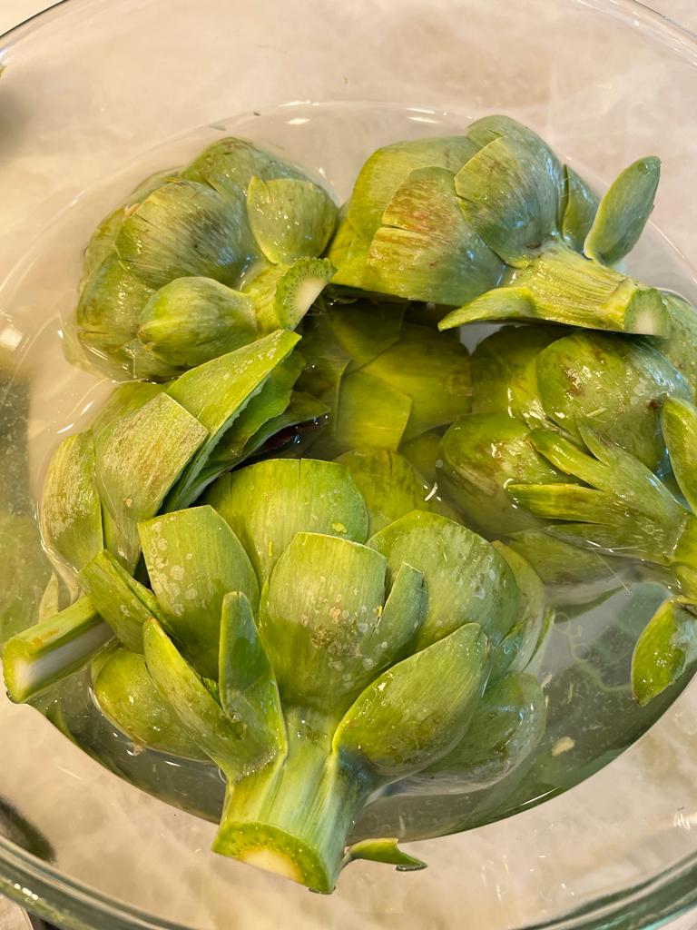- As you do this to each one, place them cut side down into the lemon water as this prevents them browning. (think of how apples, bananas and avocados spoil quickly after being cut – artichokes are exactly the same)