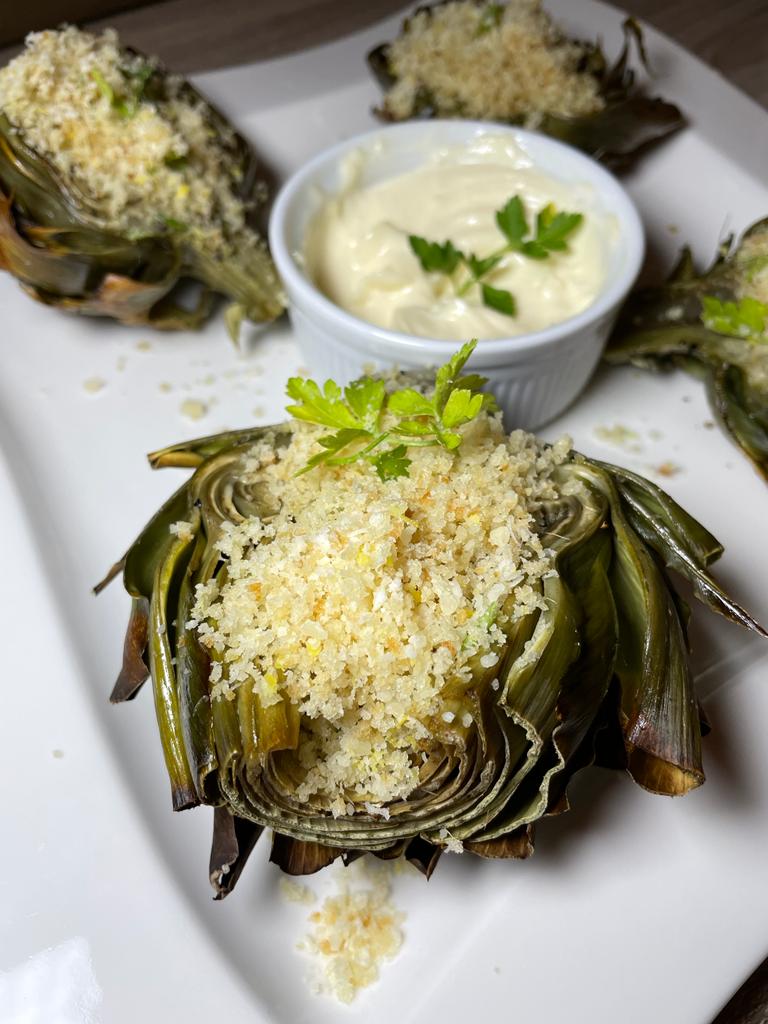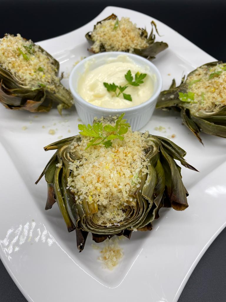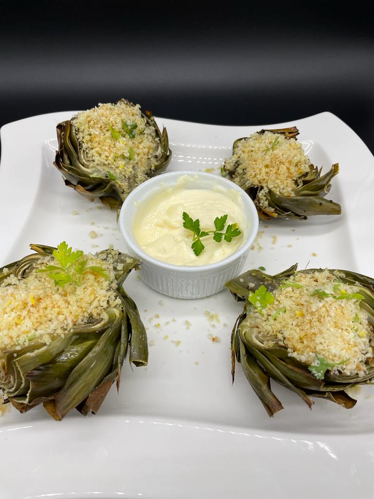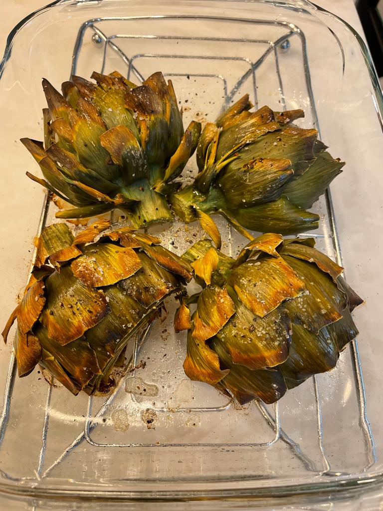 - Remove the artichokes from the baking dish and place cut side up onto a serving platter.