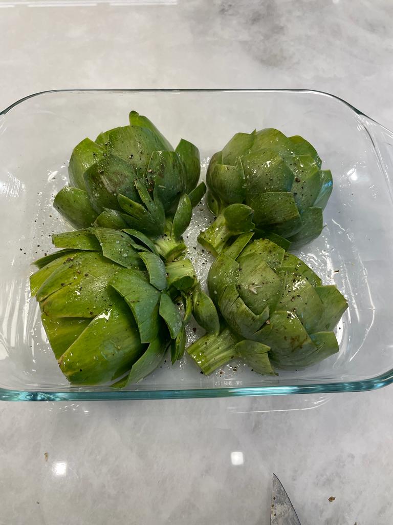 - Once all the artichokes are prepared, spray a baking dish with non stick cooking spray and place each artichoke cut side down into the dish.