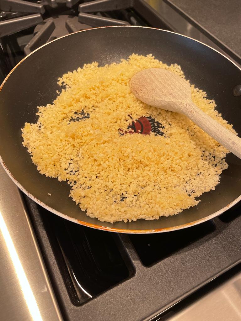 - Whilst they are roasting, prepare the crispy topping by pouring a couple of tablespoons of olive oil into a sauté pan then adding in the panko breadcrumbs.