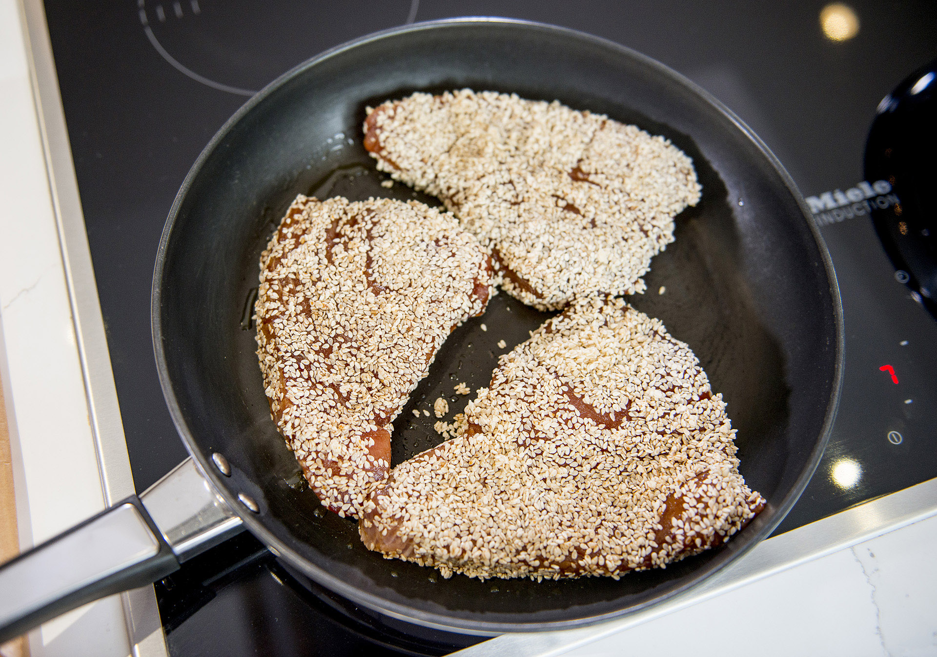 - Coat the tuna steaks in the sesame seeds pressing them into the fish then place the steaks into the hot pan.