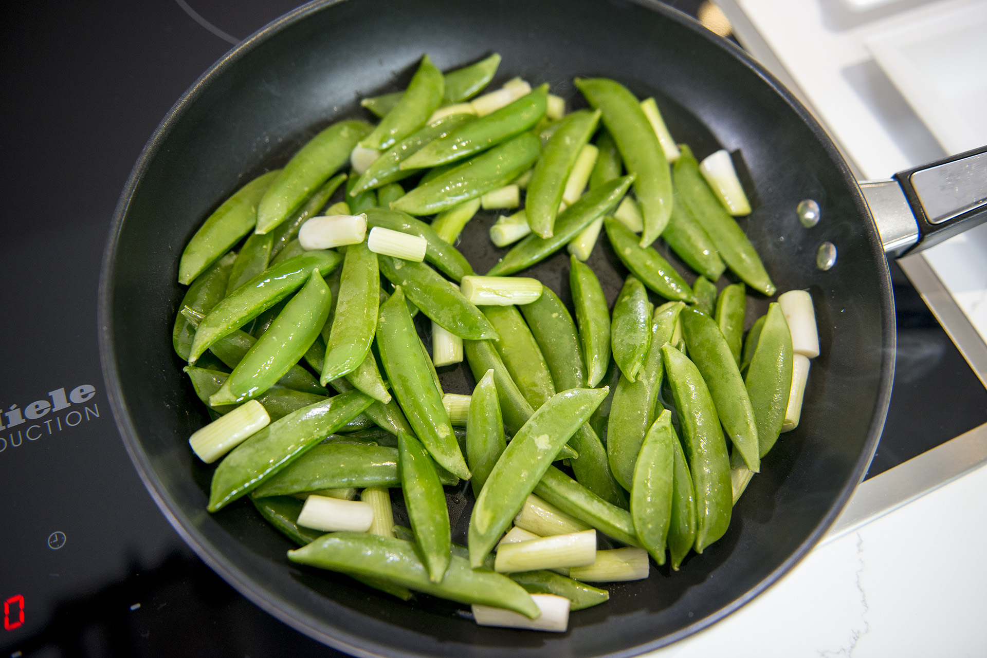 - In the meantime, heat a little olive oil in a separate frying pan on high and add in the sugar snap peas and sliced spring onions and saute for a few minutes until cooked but still crunchy. Add a splash of red wine vinegar towards the end of cooking.