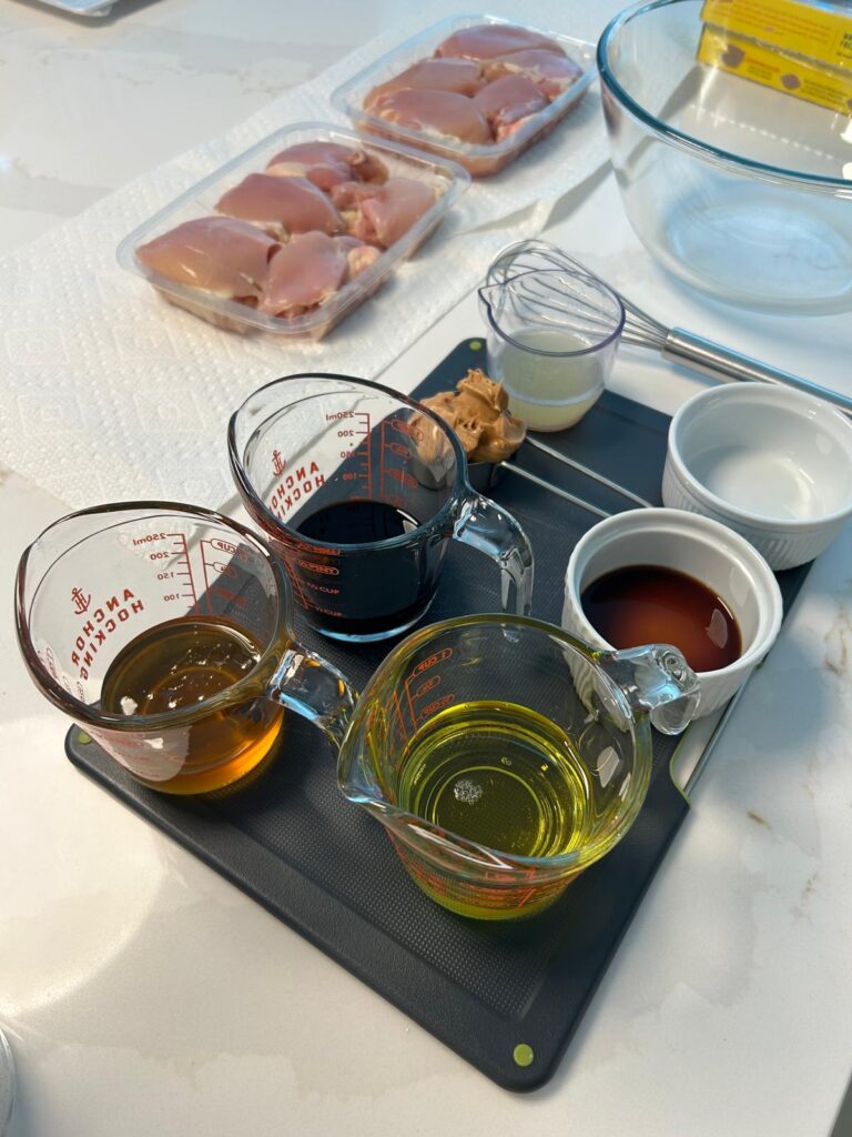 - In a bowl whisk together the honey, soy sauce, peanut butter, Worcestershire sauce, lime juice, half a cup of olive oil and season with salt and pepper.
