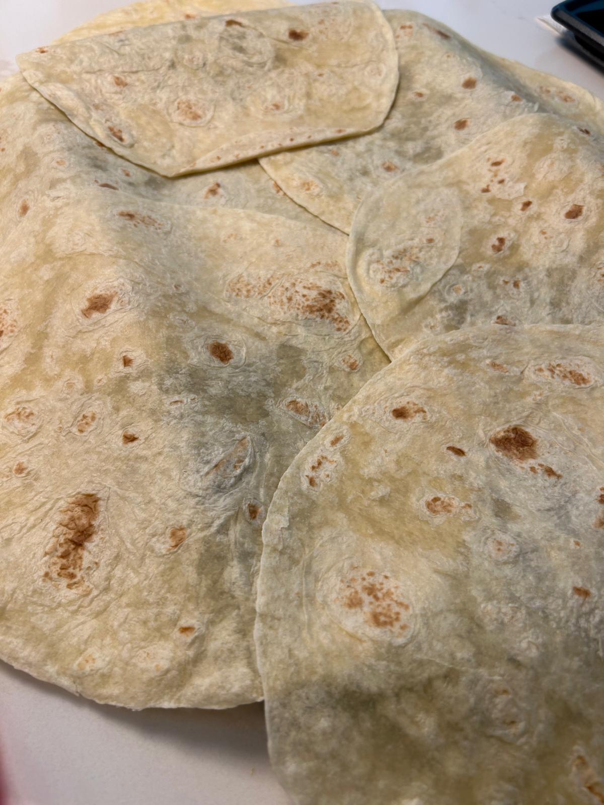 • Take a large sheetpan and arrange six of the flour tortillas around the edges and down the center leaving an overhang all the way around.
