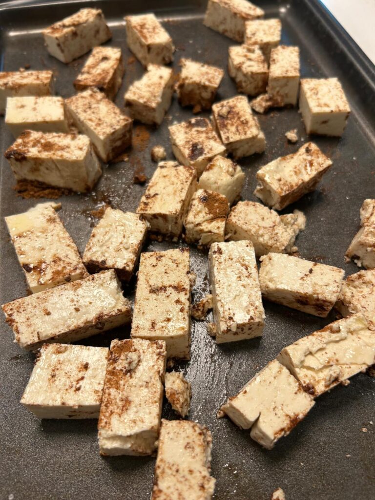 - Drain and pat dry the tofu then cut into small cubes. Drizzle with two tablespoons of oil and sprinkle with the five spice powder. Season with salt and toss to coat all sides.