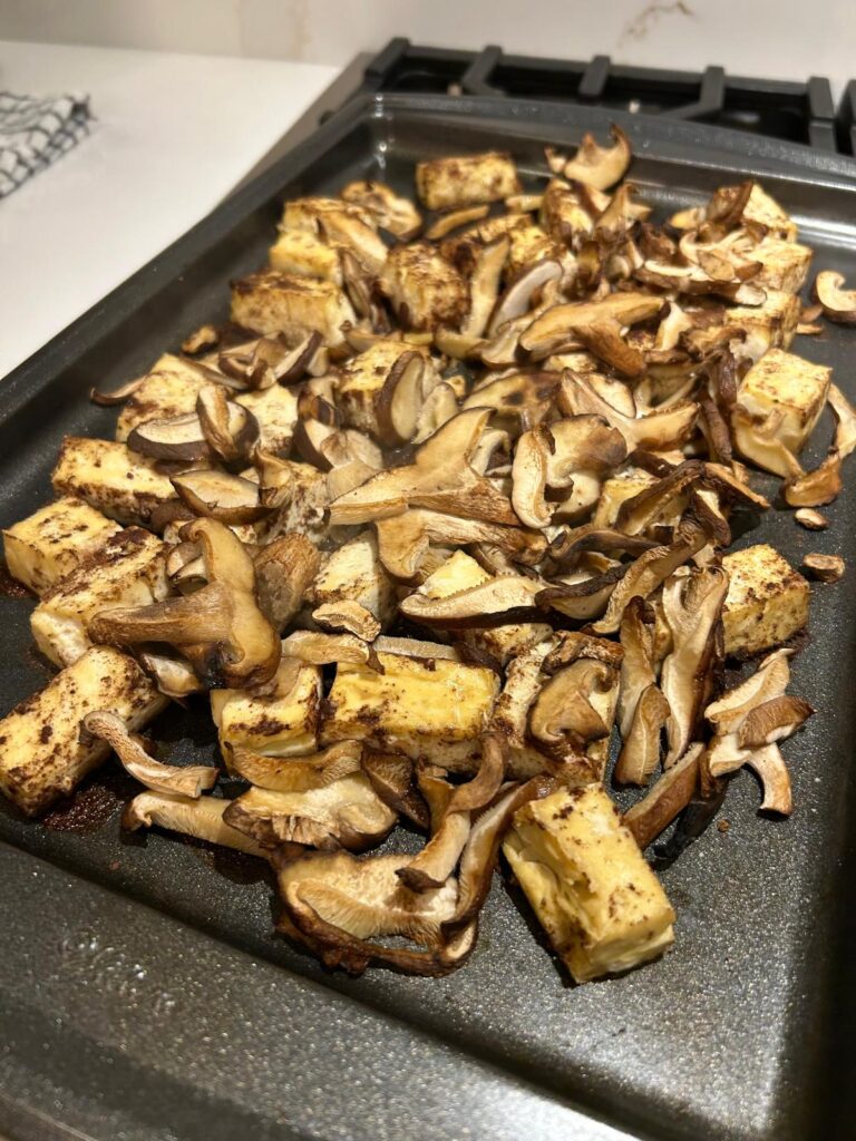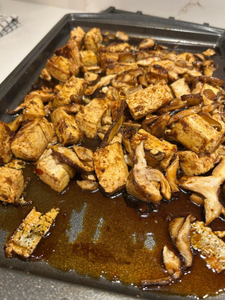 - Pour over the tofu and mushrooms, stir to coat and continue to roast for a few more minutes until sticky.