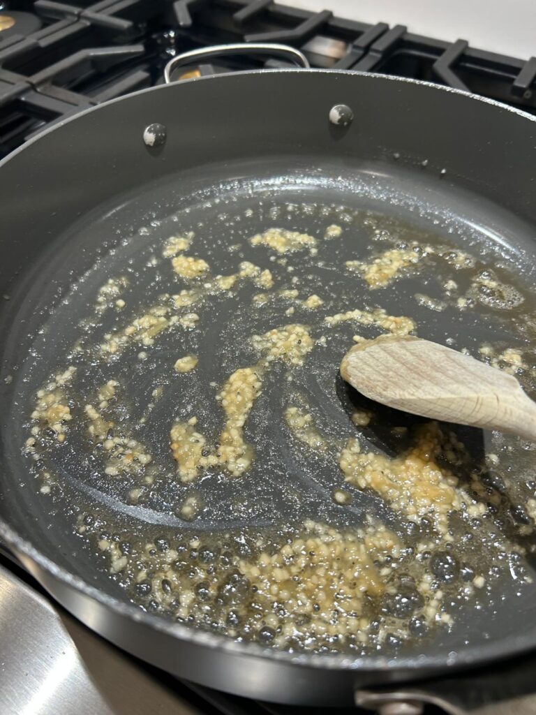 - Heat the sesame oil in a large skillet, add the garlic, and cook for 1 minute until fragrant.