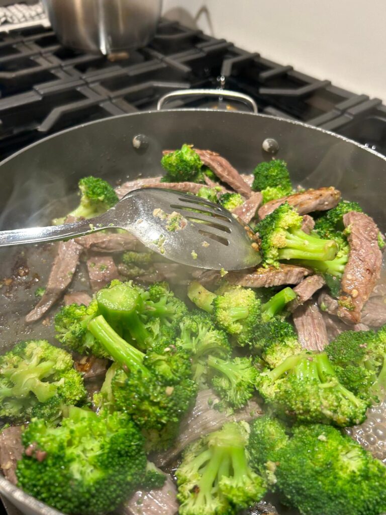 - Once the steak has cooked, add the broccoli and toss to combine.