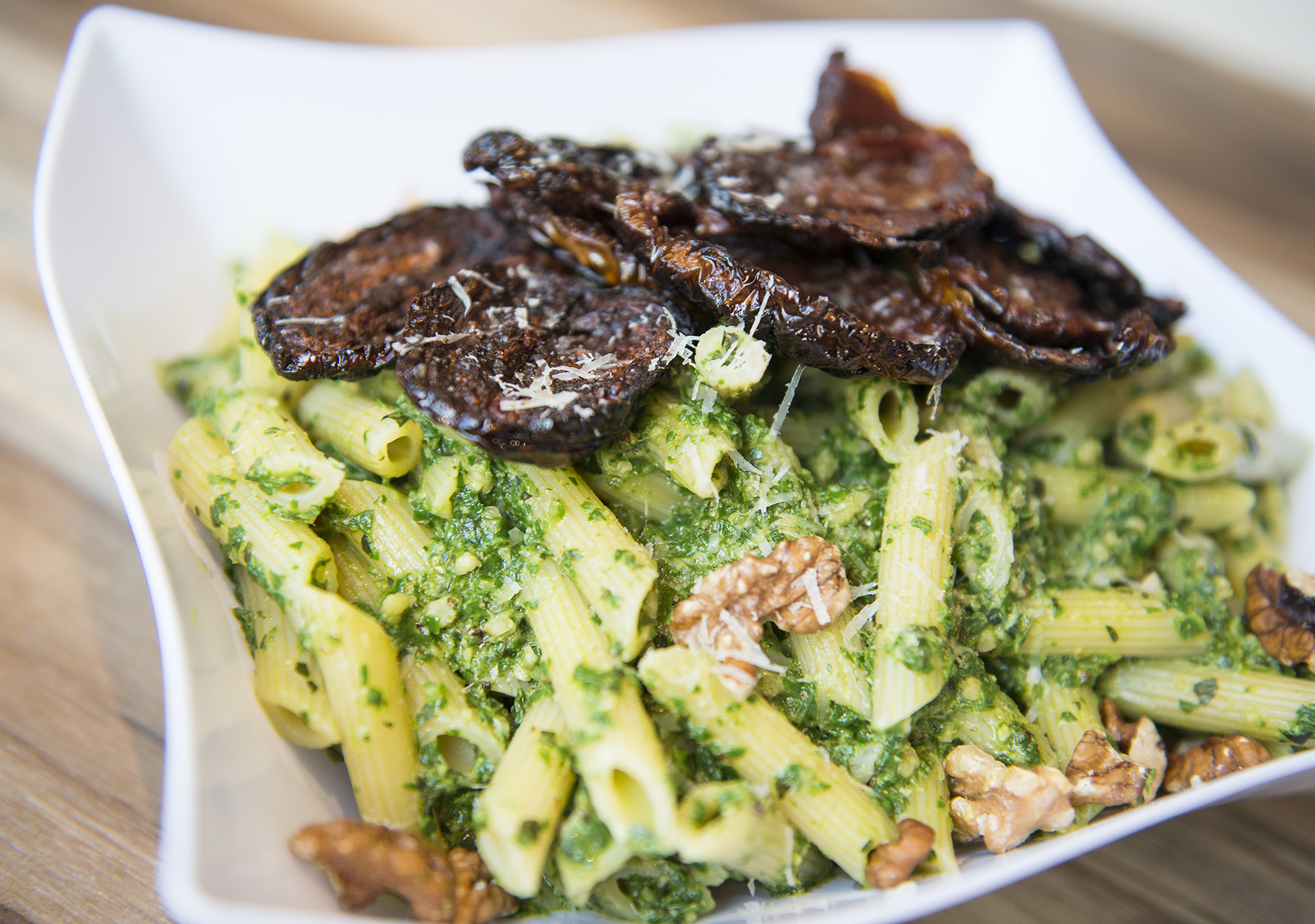 Spinach and Walnut Pesto Pasta with Crispy Sun-Dried Tomatoes