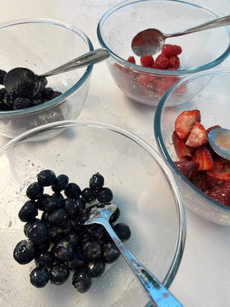• Add 2 tablespoons of sugar and ½ teaspoon of cornstarch into each berry bowl. Mix gently.