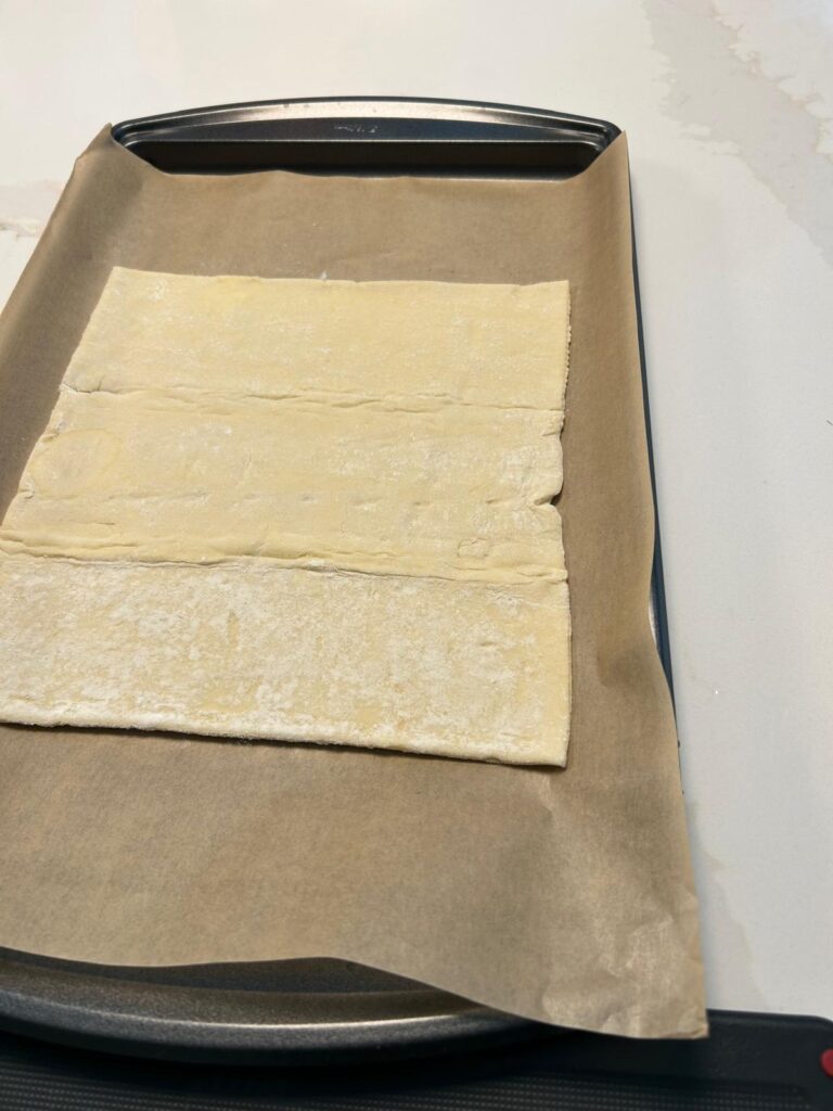 • Score a half an inch (1.25 cm) border around the pastry sheet being careful not to cut all the way through. Tip the bowls of fruit in separate rows onto the baking sheet then bake in the oven for around 20 minutes until puffed and golden