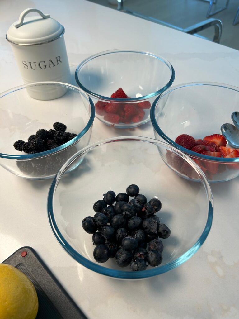 • Place the berries into four separate bowls. Zest half a lemon into each and squeeze the juice of half a lemon into each.