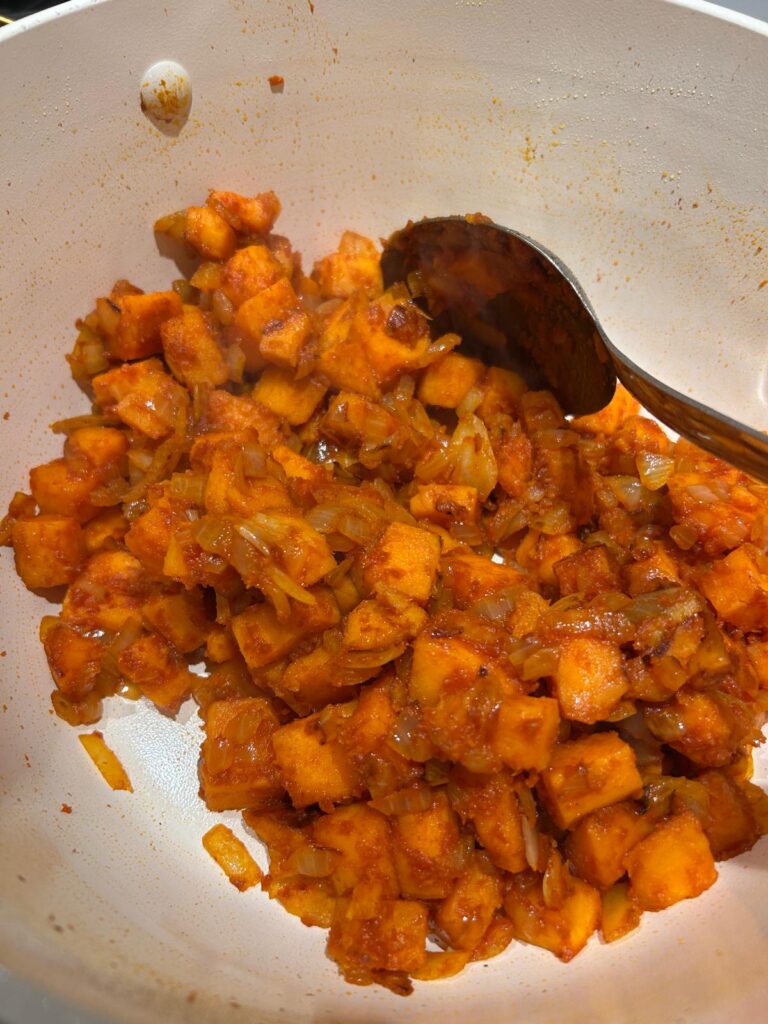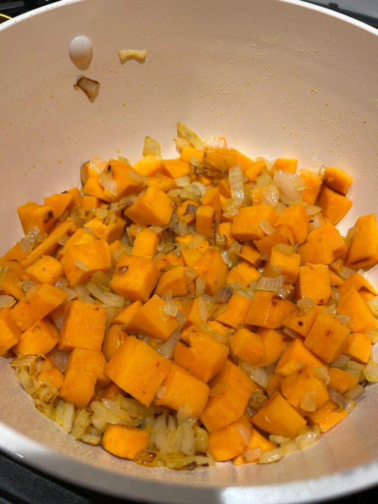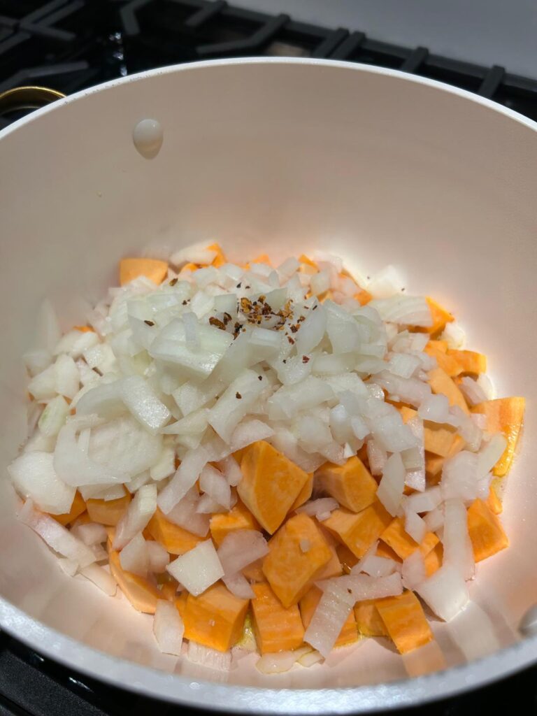 - In a large saucepan over a medium heat, heat the oil then add in the sweet potato, onion, salt and red pepper flakes.