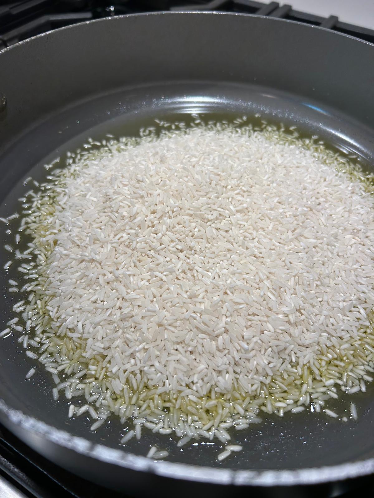 - Heat the oil in a large saucepan over medium heat. Add the rice, stirring continuously until it turns milky white (about 4 minutes).