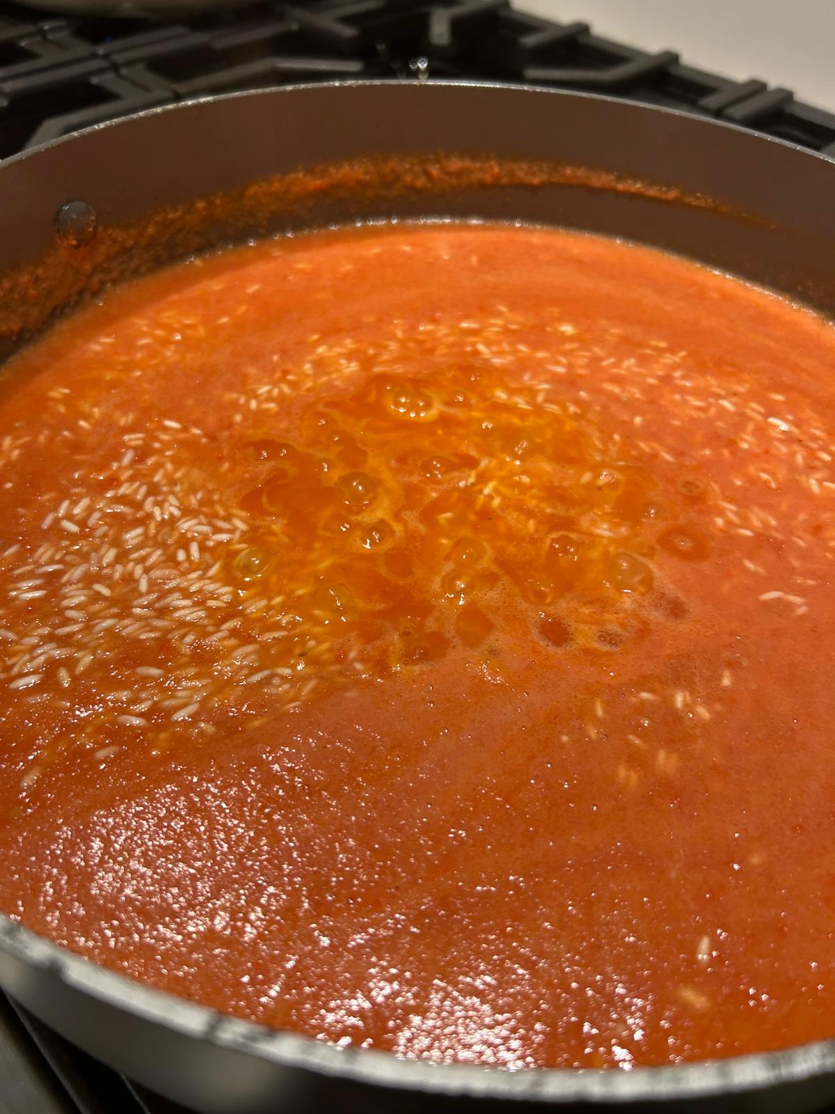 - Pour in the tomato purée and cook until the sauce thickens and is mostly absorbed by the rice.