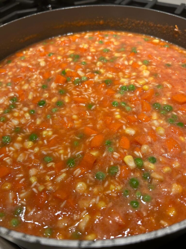 - Add the vegetable broth, corn, carrots, and peas. Bring to a boil, then reduce the heat and cover.