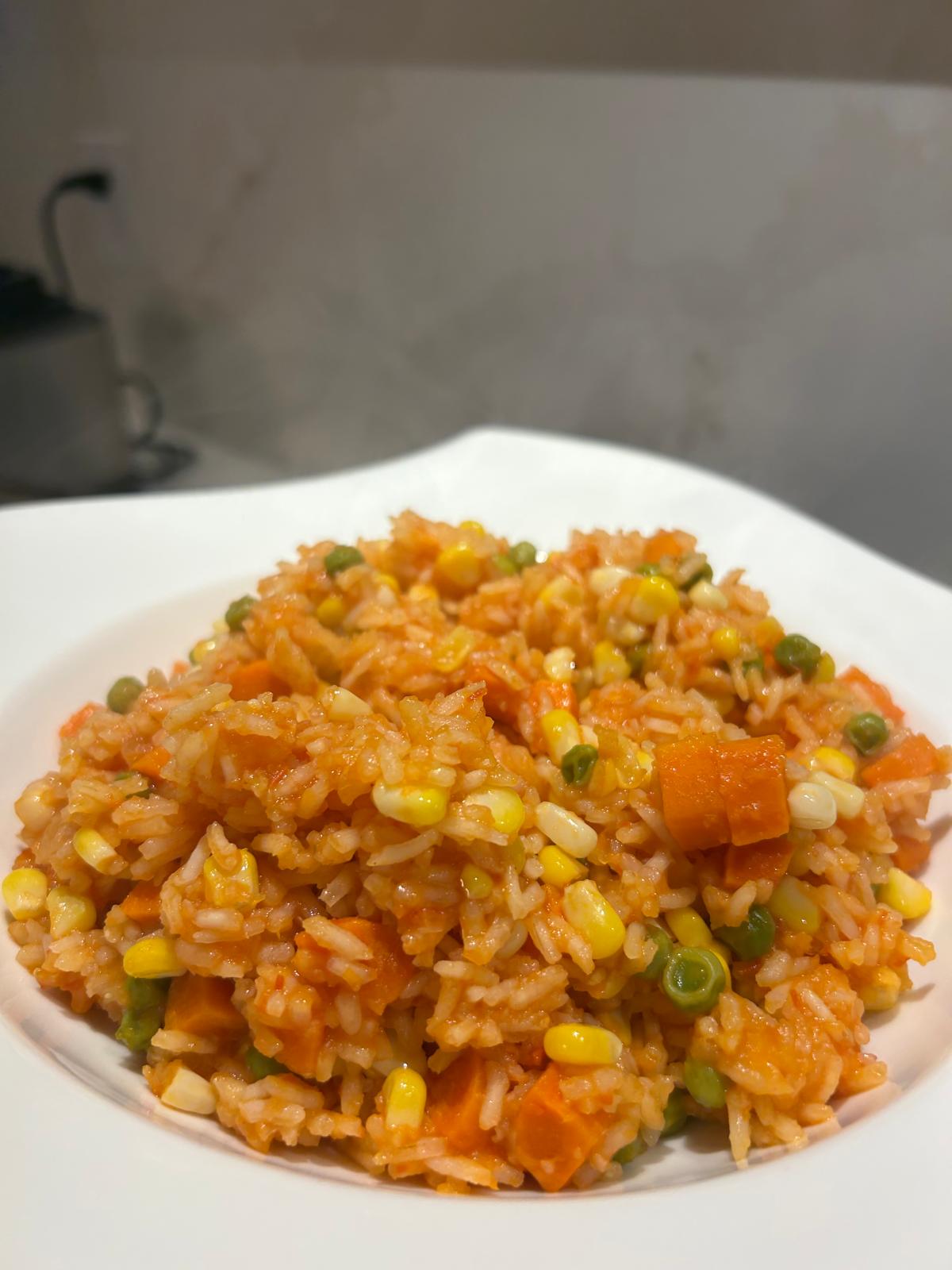 What makes this recipe special is its simple balance of freshness and heartiness. The base is a silky tomato purée made from ripe tomatoes, garlic, and onion. When combined with warm cumin, it gives the rice depth and color. Every grain soaks up that flavor beautifully. Carrots, corn, and peas add brightness and texture, turning this into more than just a side dish.