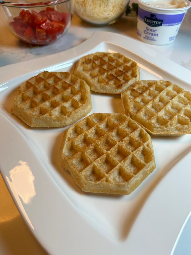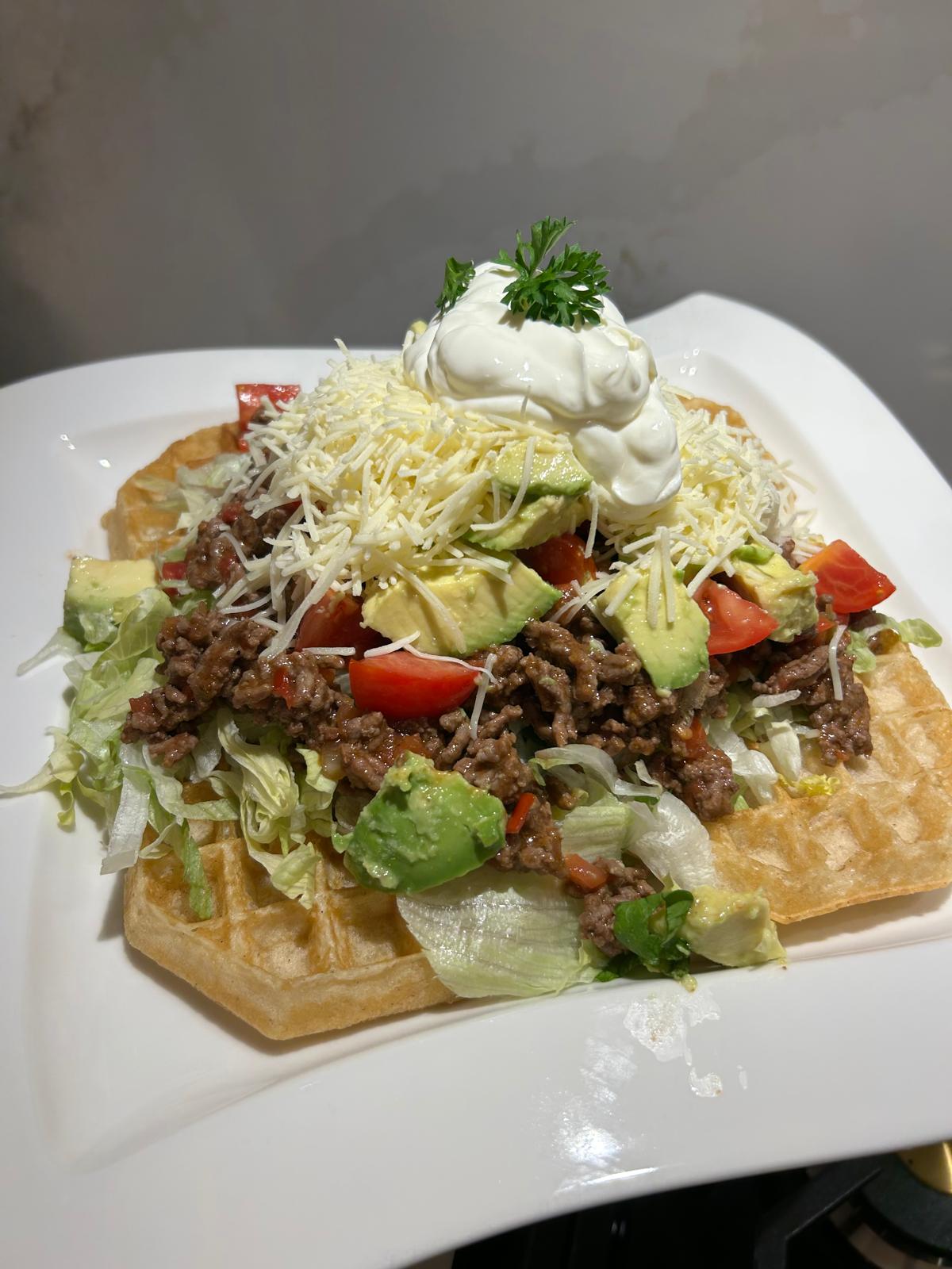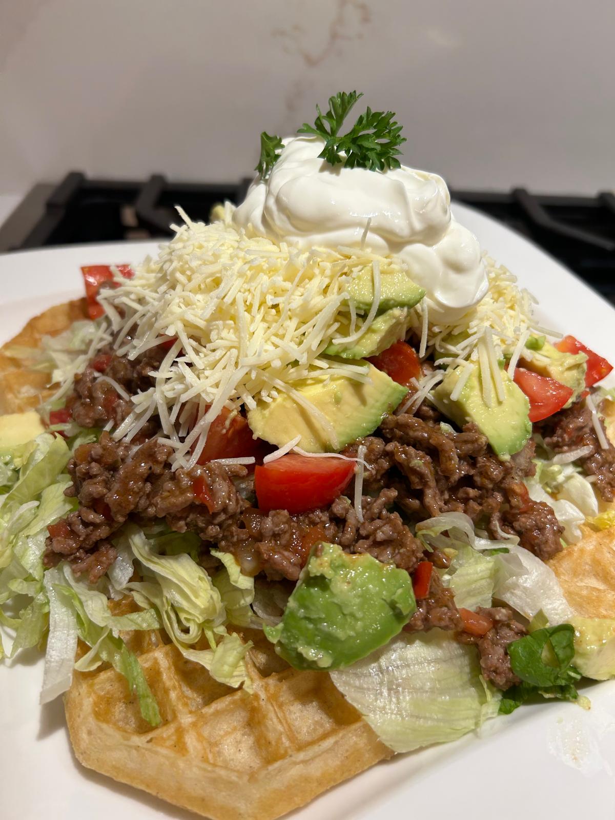 - Top each waffle with shredded lettuce, some of the beef mixture, chopped tomatoes, and diced avocado.