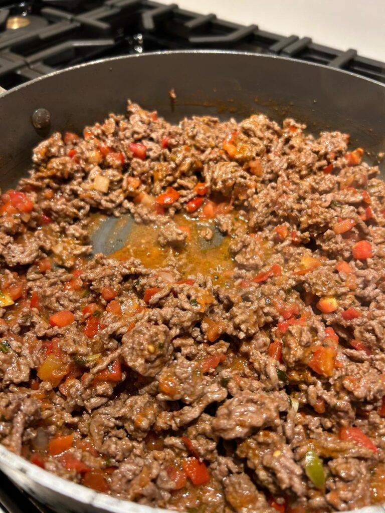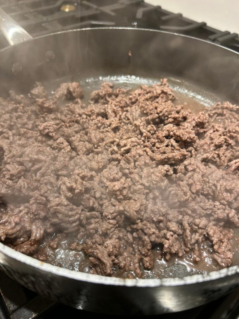 - In a medium skillet, heat a little flavorless oil over medium heat and brown the ground beef.