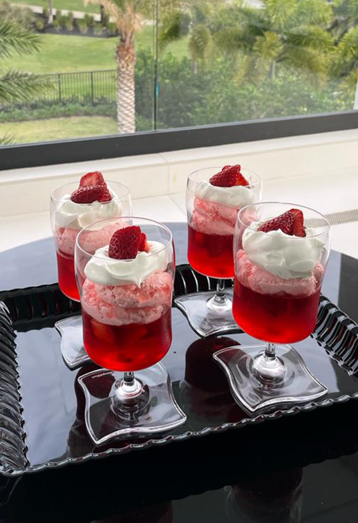 - When ready to serve, pipe the strawberry cool whip on top of the set strawberry jelly and top with a dollop of whipped cream or more cool whip and a fresh strawberry