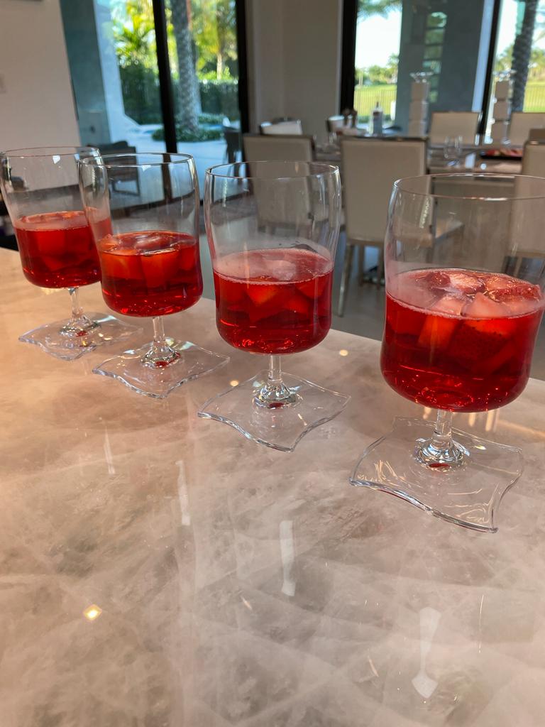 - Pour the remaining jelly liquid into four serving glasses then add the sliced strawberries into each glass