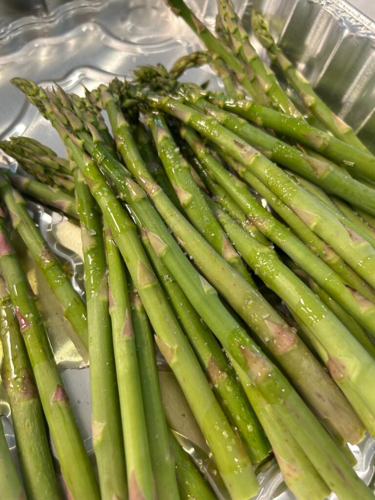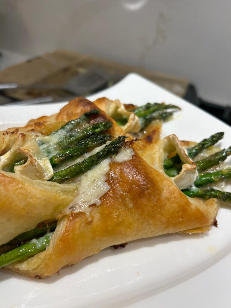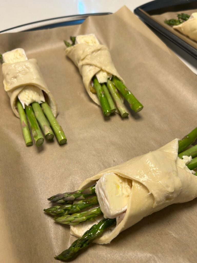 Lay a slice of prosciutto, followed by a few spears of asparagus (if they are thin then 3-4 work well) and top with a slice of brie.