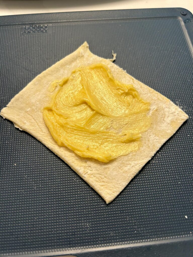 Turn the squares so that they are a diamond shape the spread a little of the butter mixture onto each one.