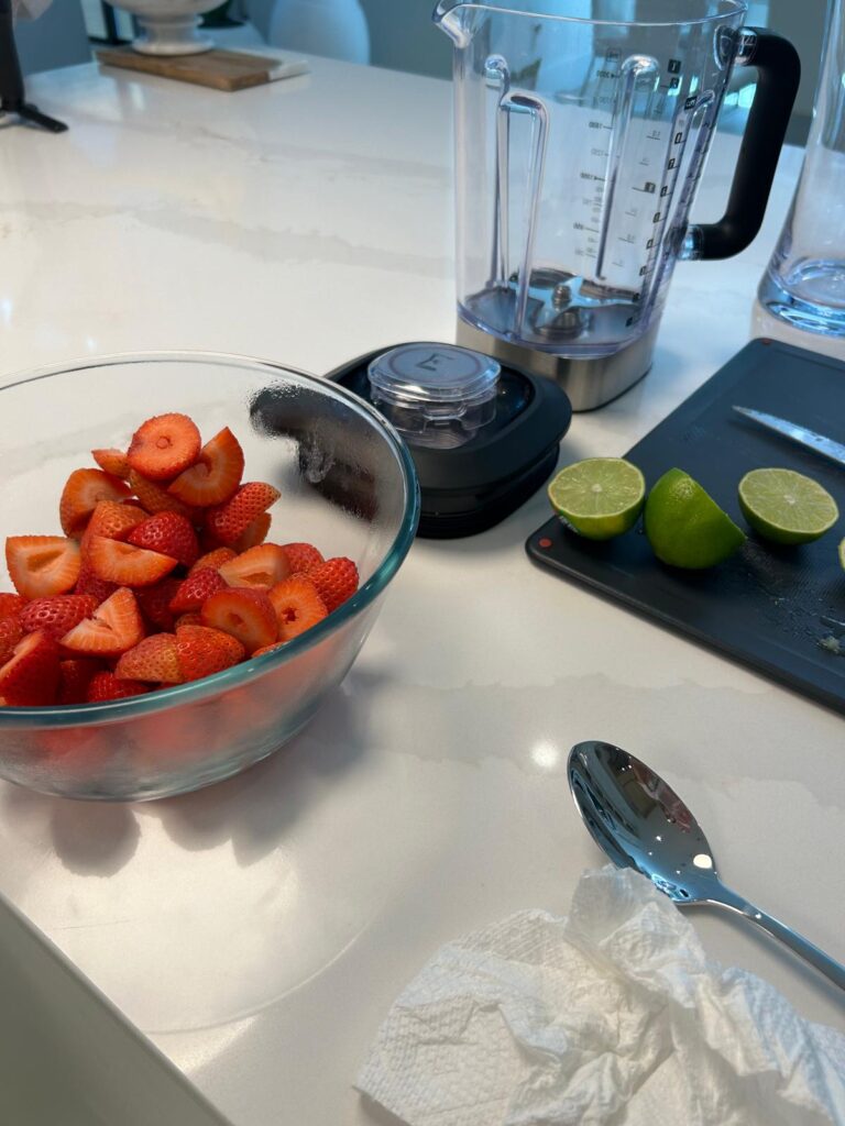 Chill for up to three days then serve over ice with a slice of lime and a fresh strawberry.