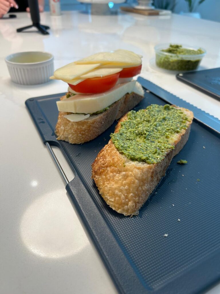 Lay the slices of provolone on top of the pesto on each slice of the bread, followed by the tomatoes, and finally the Havarti cheese.