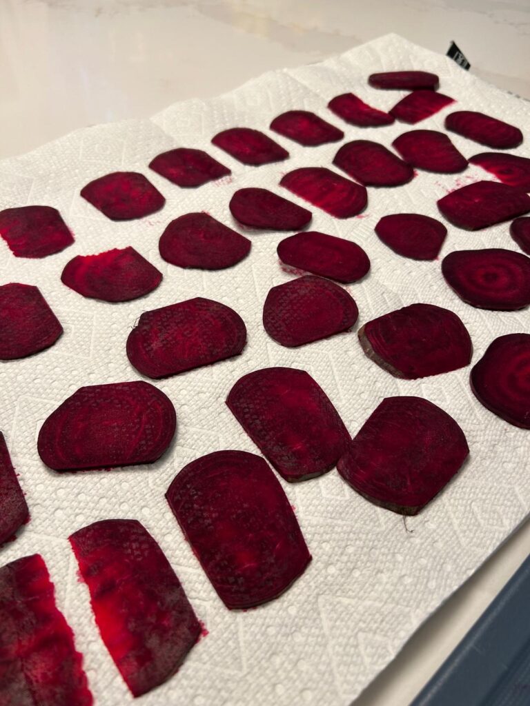 Use a mandolin to thinly slice the beets then place between kitchen paper and press to remove any excess liquid.