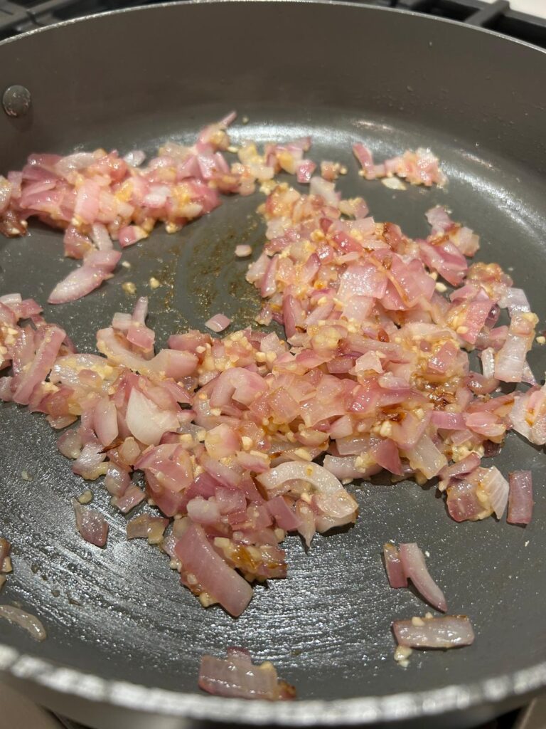 - Heat the oil in a large pan and add in the red onion and cook for around ten minutes until softened.