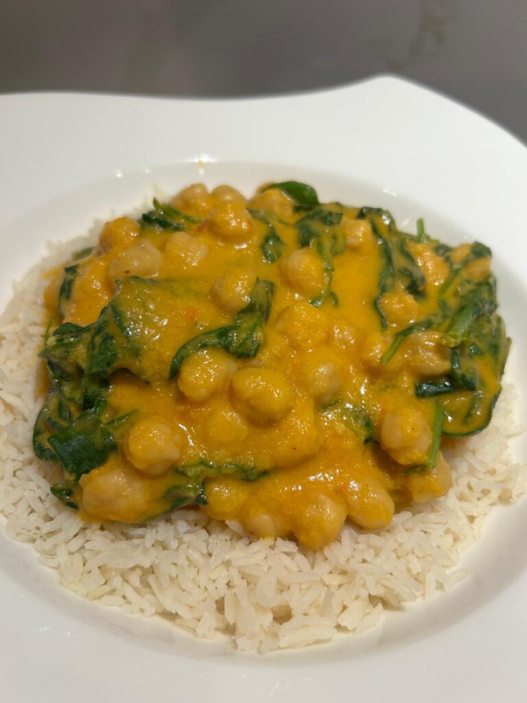 Then comes the key to the silky texture – plain yoghurt. Blended with the tomato and spice mixture, it creates a luscious sauce that’s rich but not heavy. Stirring in tender chickpeas makes this a hearty, protein-packed dish that will leave you feeling satisfied, while the fresh spinach adds a pop of color and nutrients to round everything out.