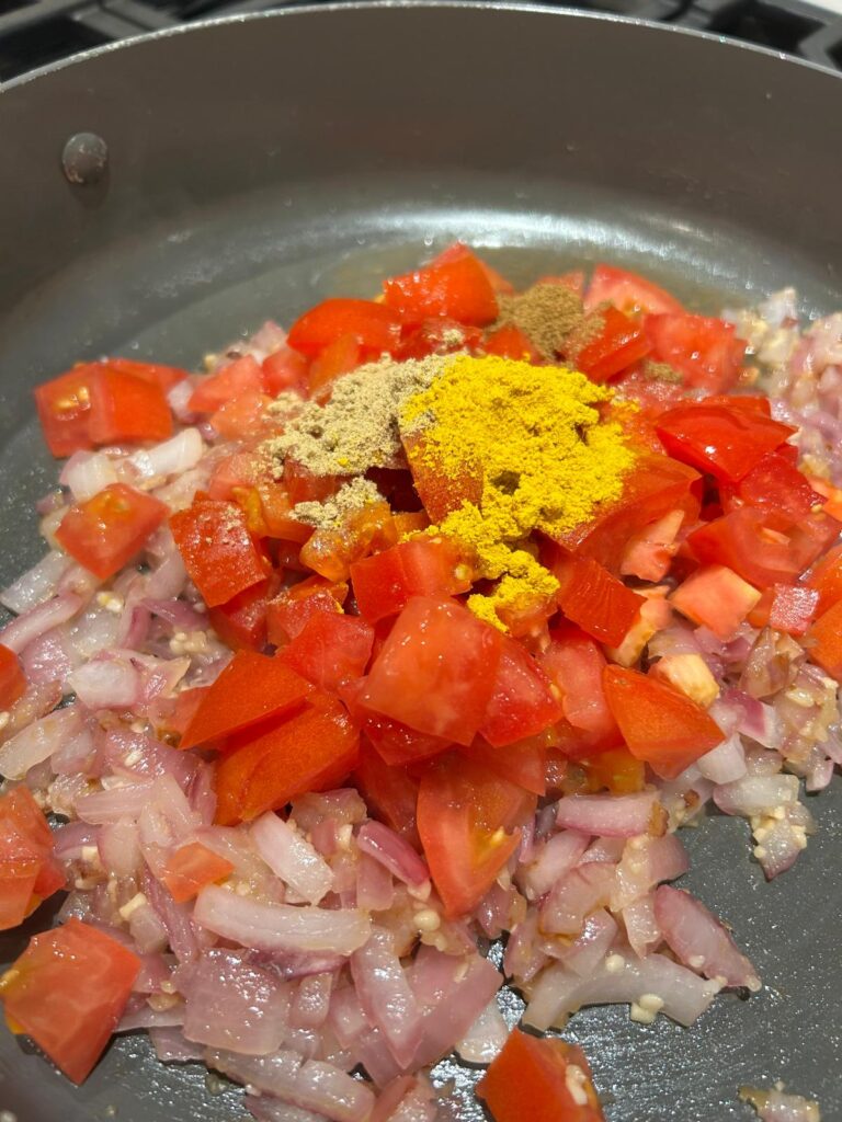- Add in the tomatoes, turmeric and coriander and season with salt.
