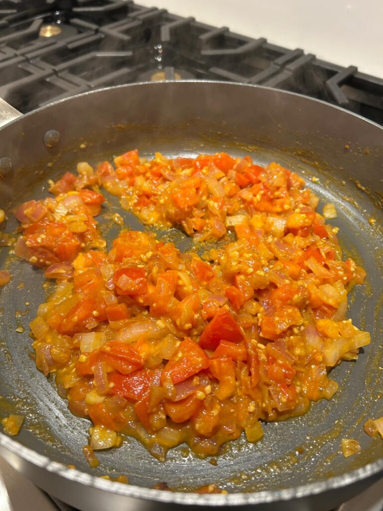 - Cook until the tomatoes have broken down and softened which will take around 15 minutes.